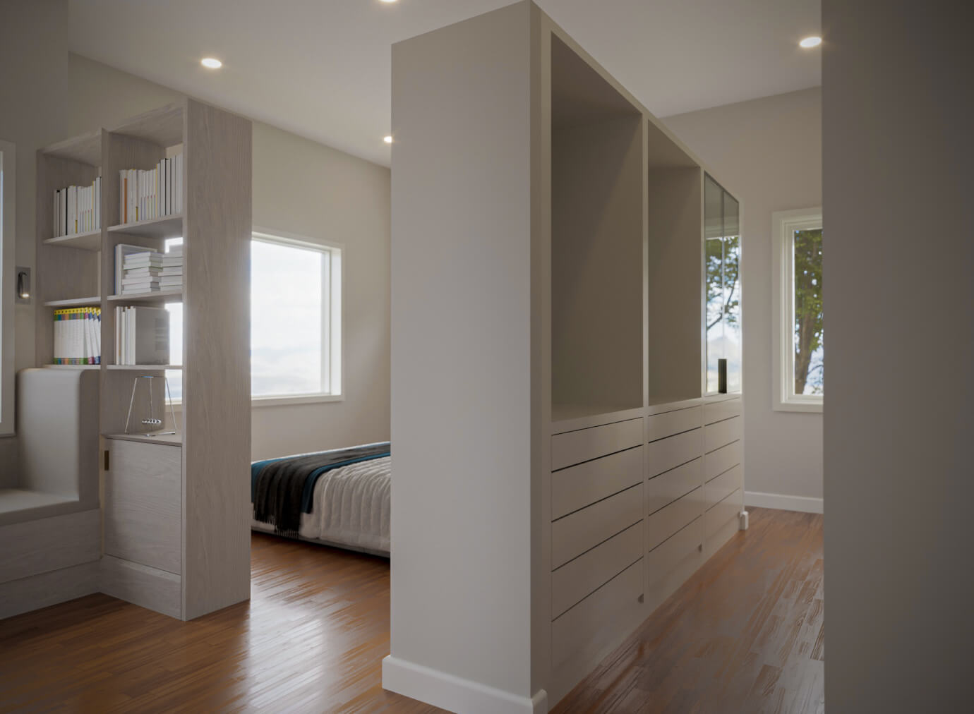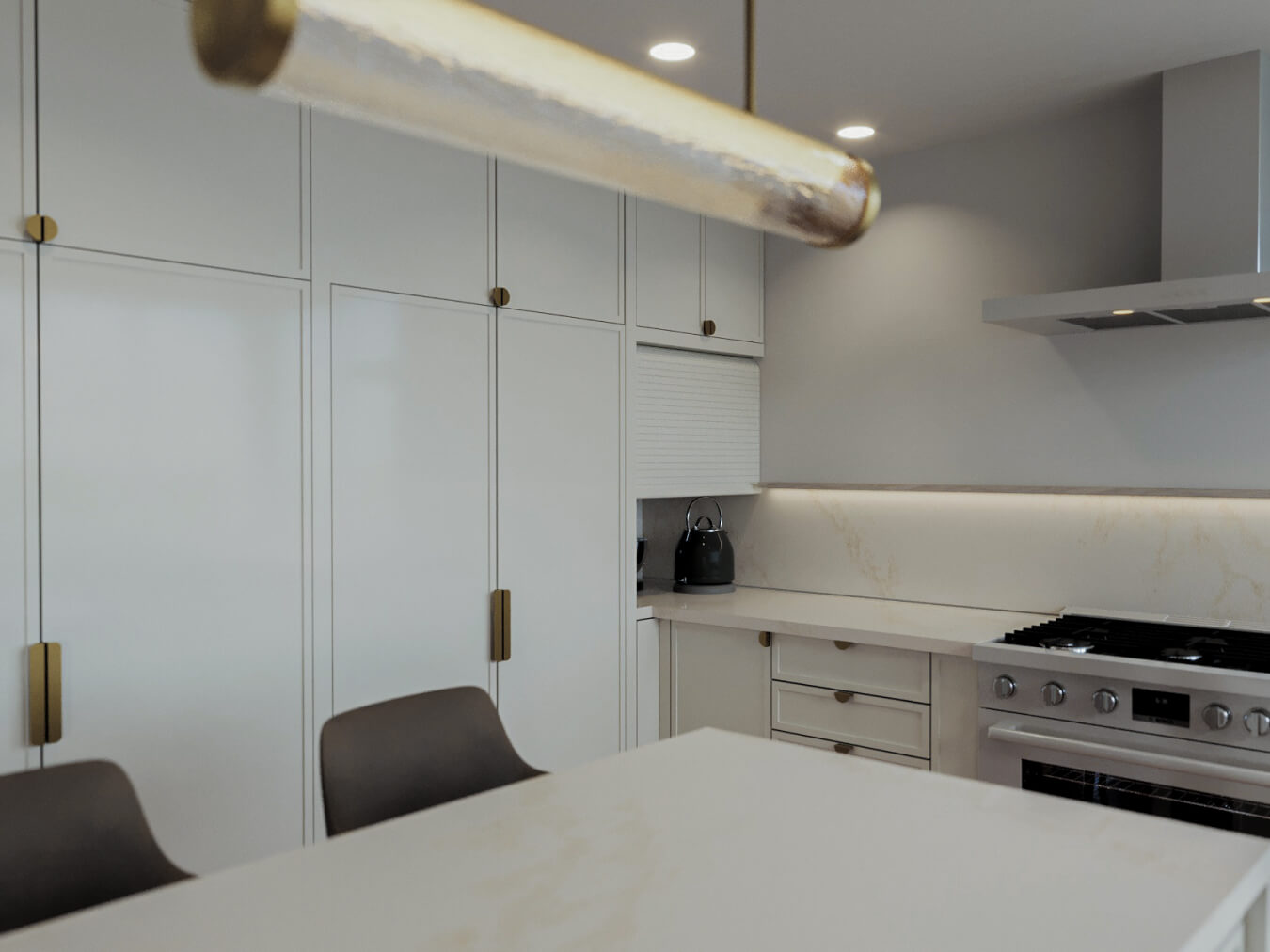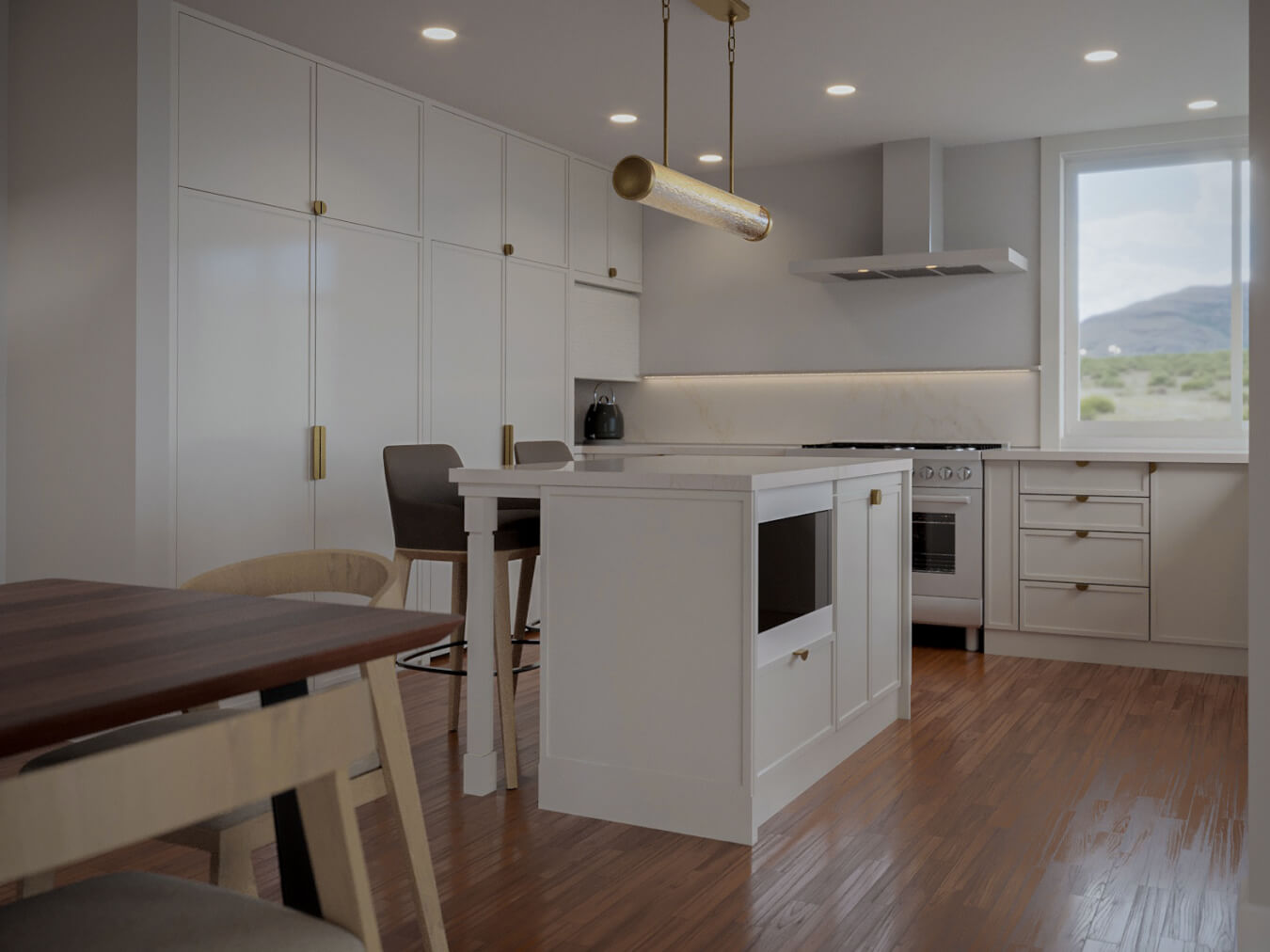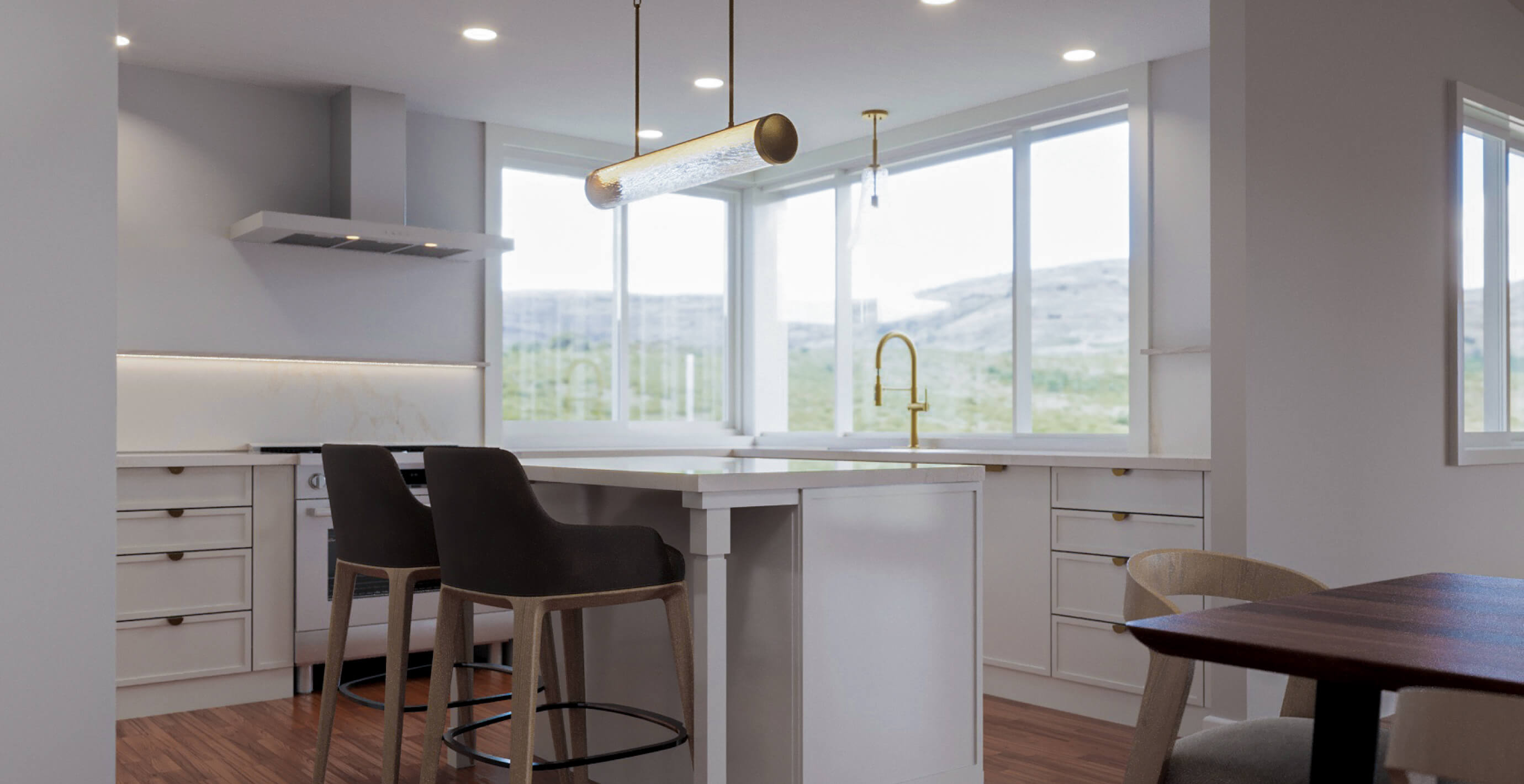 Inside, the new master suite balances privacy and connection, featuring an airy closet area, a cozy reading nook, and serene views of the surrounding hills. The expanded kitchen blends warmth and modernity, pairing crisp contemporary whites with playful brushed brass accents and striking large-format terrazzo countertops.